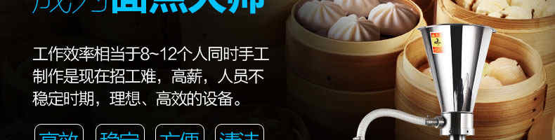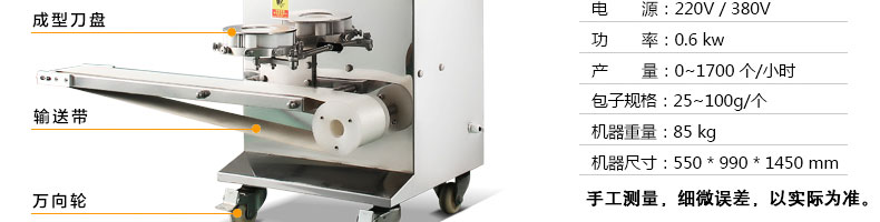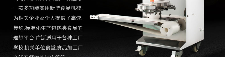 名稱XZ-10型全自動(dòng)包子機(jī) 電源220/380V(見(jiàn)機(jī)器名牌) 功率0.6kw 產(chǎn)量0-1700個(gè)/小時(shí) 尺寸550*900*1450mm(包括輸送帶) 重量85kg 規(guī)格25-100克/個(gè) 其他