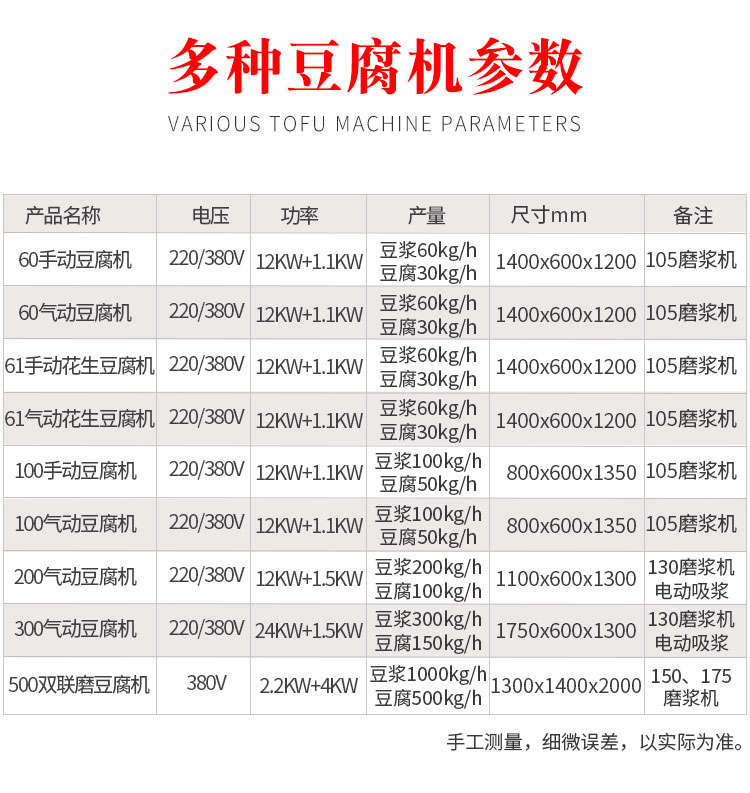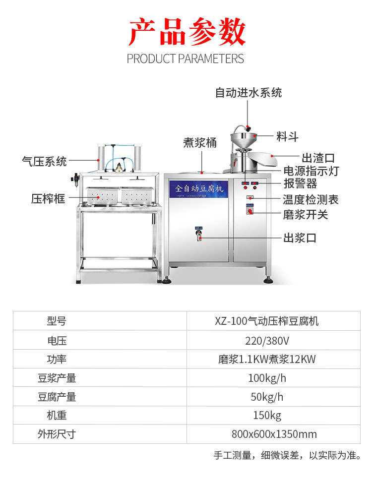 名稱XZ-100型全自動(dòng)豆腐機(jī) 電源220/380V 功率磨漿11KW,煮漿12KW 產(chǎn)量豆?jié){產(chǎn)量100kg/h,豆腐產(chǎn)量50kg/h 尺寸800X600X1350mm 重量150kg 規(guī)格聯(lián)系銷售員 其他