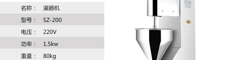 名稱SZ-200灌腸機 電源220/380V(見機器銘牌) 功率1.14-1.5kw 產(chǎn)量200千克/小時 尺寸520*390*1320mm 重量80kg 規(guī)格 其他