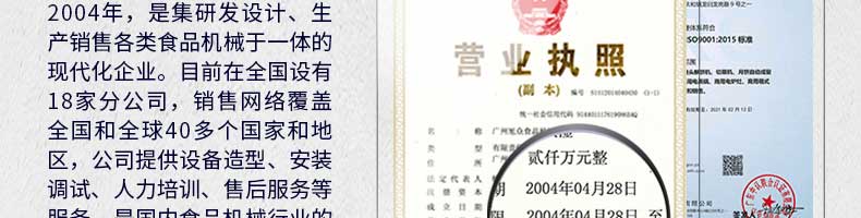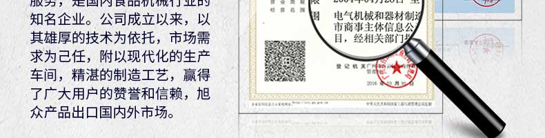 廣州旭眾食品機械有限公司是一家集科研開發(fā),生產設計,營銷服務為一體的現(xiàn)代化生產企業(yè)?,F(xiàn)代化生產車間,精湛制造技術,所產機械歷經市場重重考驗,不斷贏得海內外客戶的贊譽。