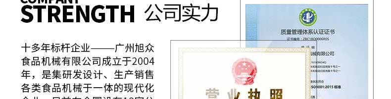 廣州旭眾食品機(jī)械有限公司是一家集科研開(kāi)發(fā),生產(chǎn)設(shè)計(jì),營(yíng)銷服務(wù)為一體的現(xiàn)代化生產(chǎn)企業(yè)?,F(xiàn)代化生產(chǎn)車間,精湛制造技術(shù),所產(chǎn)機(jī)械歷經(jīng)市場(chǎng)重重考驗(yàn),不斷贏得海內(nèi)外客戶的贊譽(yù)。
