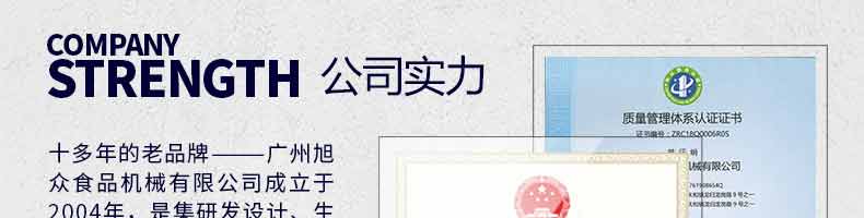 廣州旭眾食品機(jī)械有限公司是一家集科研開發(fā),生產(chǎn)設(shè)計(jì),營(yíng)銷服務(wù)為一體的現(xiàn)代化生產(chǎn)企業(yè)?,F(xiàn)代化生產(chǎn)車間,精湛制造技術(shù),所產(chǎn)機(jī)械歷經(jīng)市場(chǎng)重重考驗(yàn),不斷贏得海內(nèi)外客戶的贊譽(yù)。